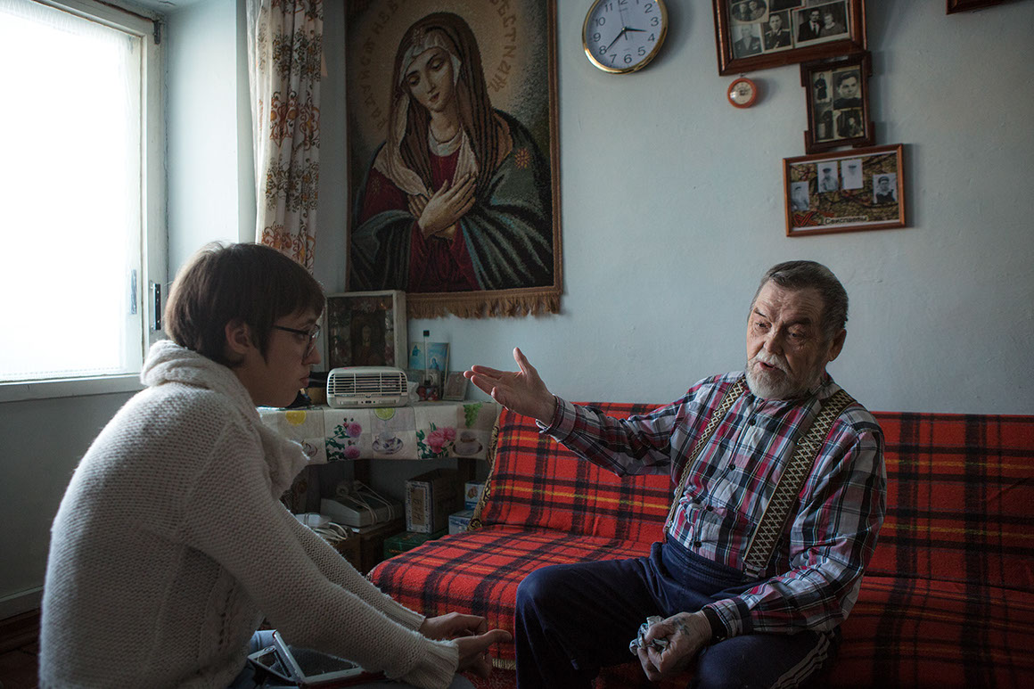 Георгий Арсентьевич усаживается на диван, кумачовый цвет пледа сливается с цветом рубахи. Арсентьич смеется своей беззубой улыбкой и обижается, если его называть дедушкой. И рассказывает про дедов.
