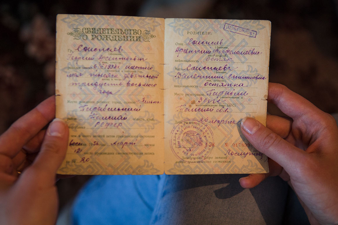 Георгий Арсентьевич достает коленкоровую барсетку для документов и вытаскивает оттуда паспорт. Просит найти надпись «остяк». В паспорте российской федерации графы национальность нет, следовательно, надписи «остяк» нет. Тогда Арсентьич отправляется на поиски свидетельства о рождении. Находит там напротив имен родителей «остяк» и нежное женское «остятка».